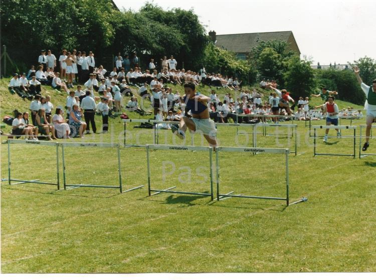 Ozzie striding ahead in the hurdles, for Lea House. Date and details needed.