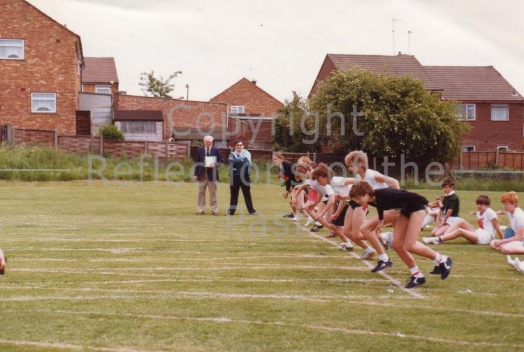 Mr Heaney watches the start of a girl's race on sports day. Date and details needed.
