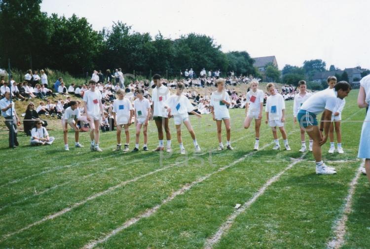 Mr Wyre and a number of students limber up before a race. Date and details needed.