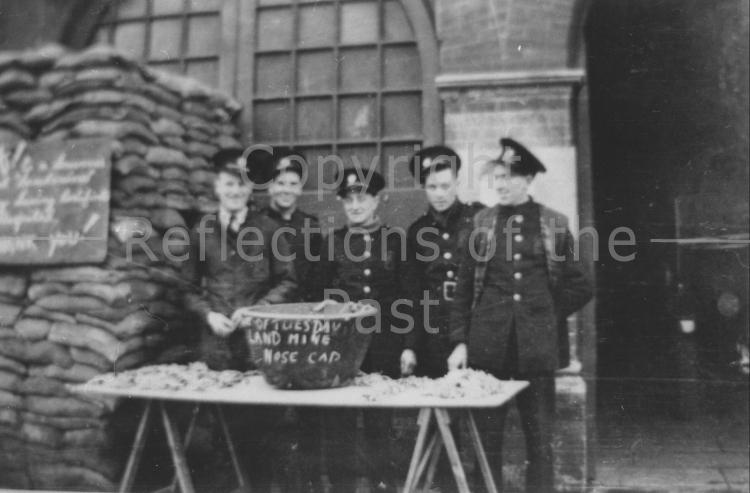 Firemen, outside the Town Hall Fire Station, selling souvenirs from the parachute mine that fell in the watercress beds behind the Romeland. 19th April 1941.