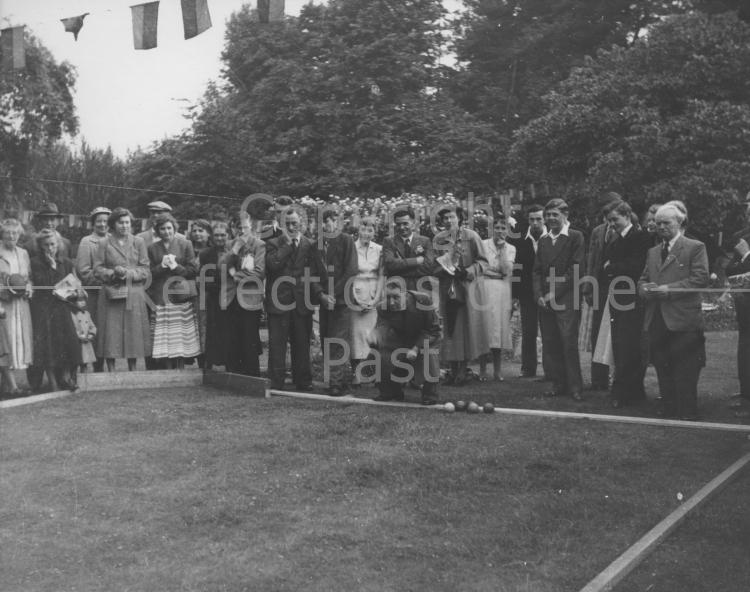 The Rev. A. V. G. Cleall, bowling for a pig at a Church Fete held in the gardens of Joyce House, Farm Hill Road. This picture c1950.