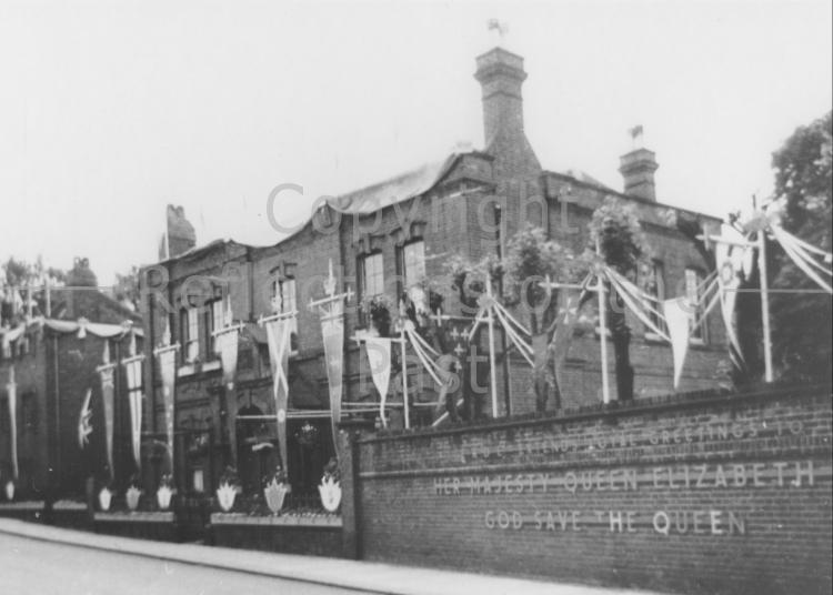 Government House, Highbridge Street. The message on the wall reads 'E.R.D.E. extends loyal greetings to Her Majesty Queen Elizabeth 2nd, God save The Queen'. Coronation, June 1953.