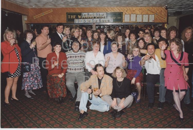 i can name about 4 or 5 people in this picture: I (michael dias) am approx the 5th person from the right in the back row (just behind the blonde smiling girl who i think is sharon kennedy),the guy in the white shirt in front of her is peter (paddy) johnson,the 2 girls in grey and white are the girls who organized it: lesley ladbury and christine smith,and the man in the patterned jumper i think is pietro mendola.unfortunately i can't recognize (from this picture at least) any of the others,but i would also like to know,p.s.lesley-if you are doing another reunion please let me know,i have moved since the last time,so my e-mail address is below.