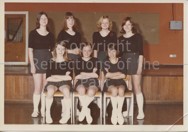 Class photo shot on the stage in the school hall. Form and student names needed. Back row.L to R. Jackie Payne,Tracey Oak,Tracey Harding and Lesley Haines.Front Row. L to R Julie Hockley, ? ,and Jeanette Schmidt |