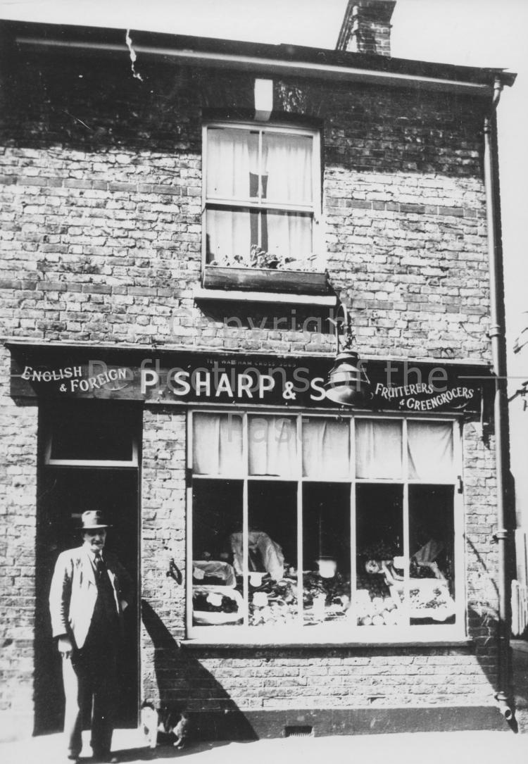 Fruit and Greengrocery shop of Percy Sharp at 27 Sewardstone Street. This building was demolished in 1962 and Mr Sharp moved to 15 Market Square. This picture c1950.