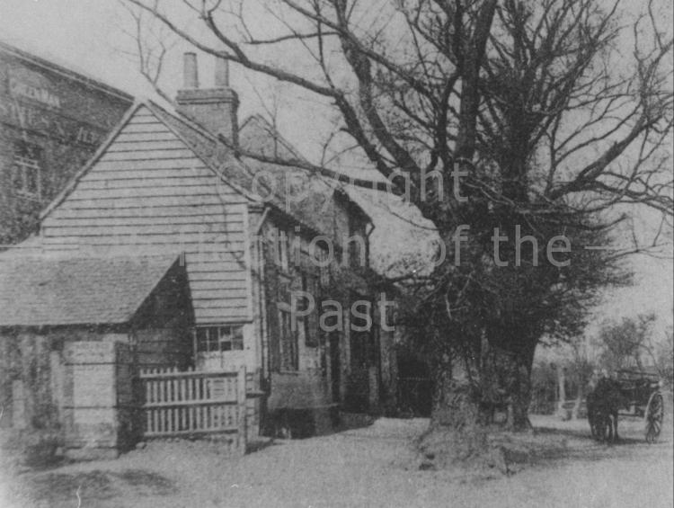 The Old Green Man public house with the new building behind it. The tree remained for many years and was used as a roundabout for the buses that terminated here.