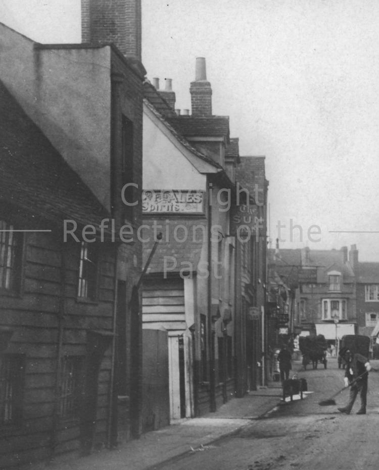 View from middle of Sun Street, looking west. In the centre is the Sun Inn, which gave it's name to Sun Street. Further along is the White Lion Public House with Market Square houses in the background.