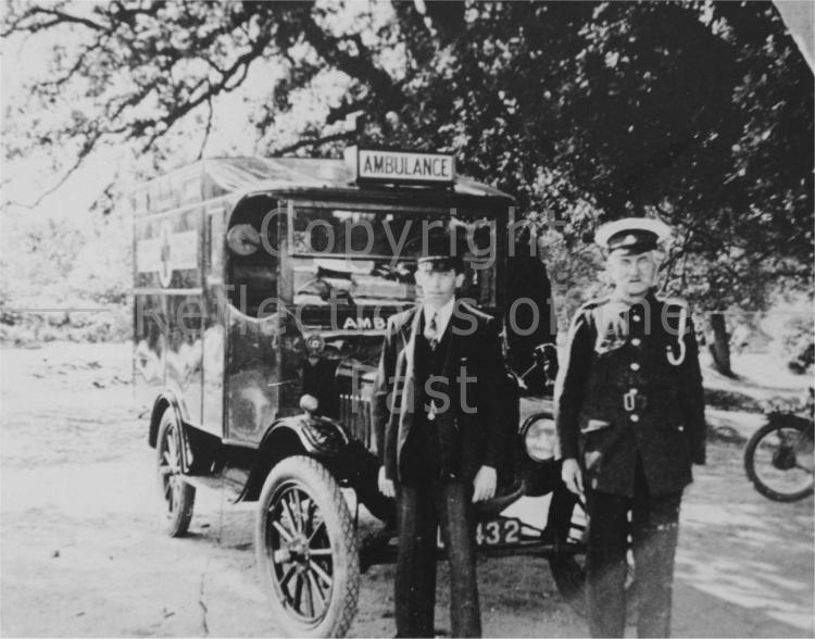 William Ward and Alex Fergusson with British Red Cross Ambulance. Pictured at the Wake Arms in 1920s.