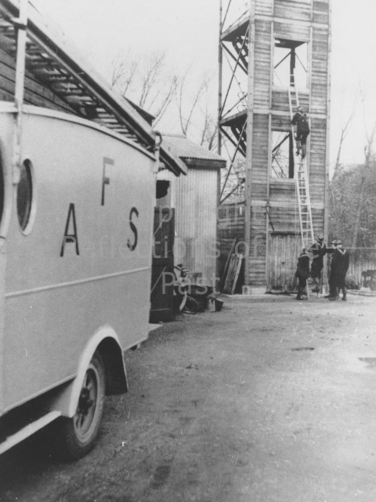 TThe Auxiliary Fire Brigade at the practise tower in the council yard, Orchard Gardens.
