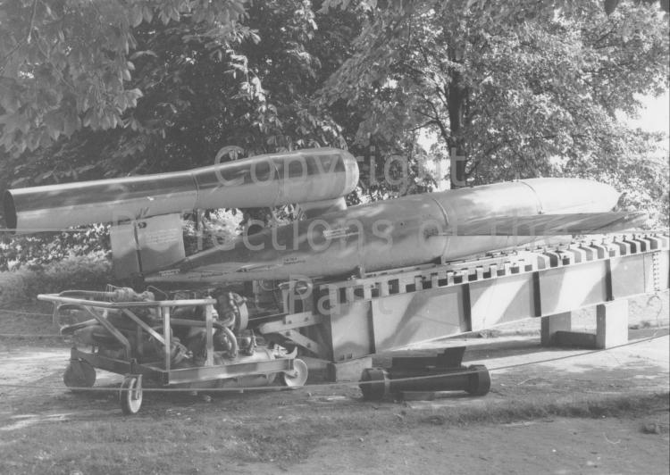 A V1 Doodlebug on its launching ramp. These were active during 1944 & 1945. When the engine stopped, it dived to the ground and explodede. This picture was taken in 1996 at the Imperial War Museum, Duxford.