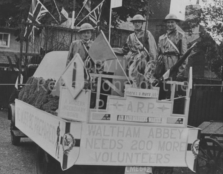 An ARP float, recruiting for volunteers to join the ARP, during the 1939 Carnival. Pictured are L-R: Leonard Windle, Cyril Eagle, Mr Cucklow,
