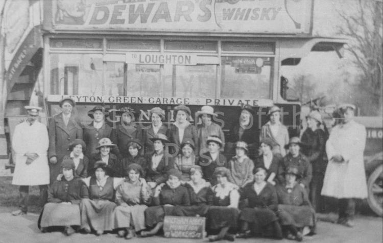 Munition Workers from the Royal Gunpowder Factory, with their general omnibus transport. 1917.