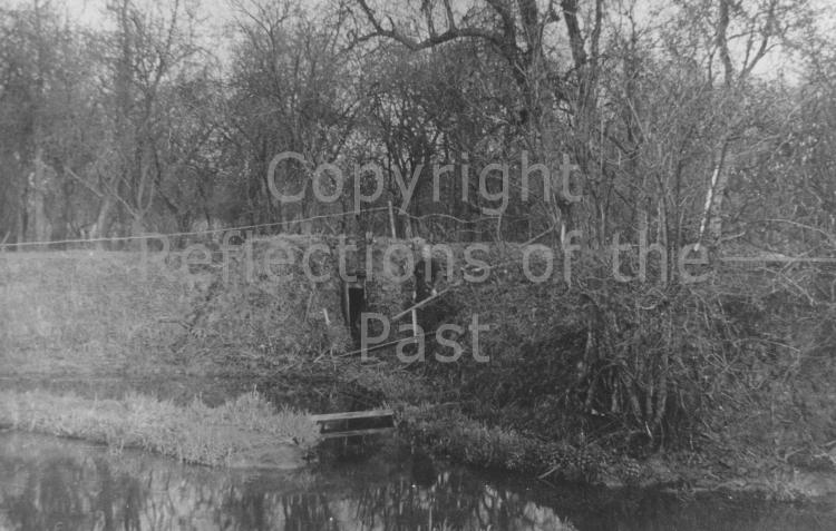 A World War One air raid shelter built in the Abbey gardens for workers in the watercress beds and the orchard. The shelter was refurbished for use again in the Second World War. This picture dated 1915. Mrs Prior can be seen pictured at the entrance to the shelter.