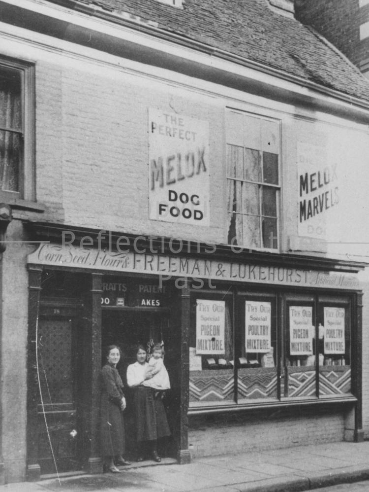 Freeman and Lukehurst's, Corn, Seed and Flour Shop at 18 Sun Street. This was the forerunner of today's pet shops, when people kept chickens, pigeons and rabbits in their backyards, as well as domestic pets. Picture c1928.