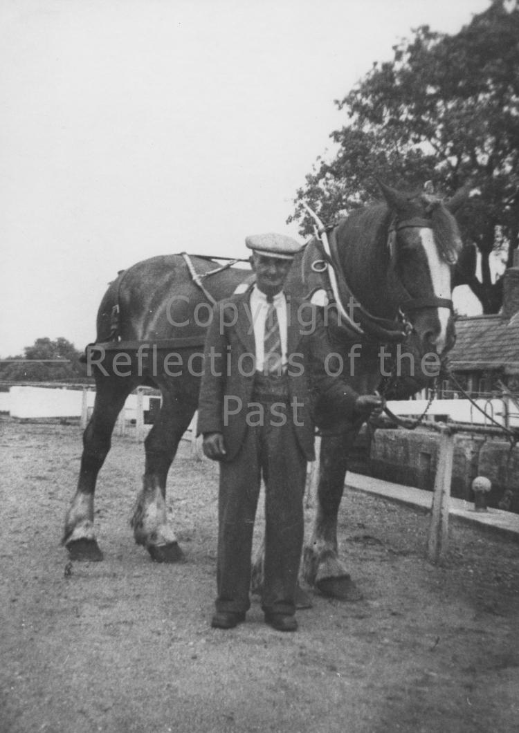 Mr Harry Goodey with his barge horse. Barge horses towed barges laden with coal, timber and other goods on the River Lea between London and Hertford. Barges often moored near Waltham Lock overnight and the horses were stabled at the rear of The Old English Gentleman Public House. This picture c1950.