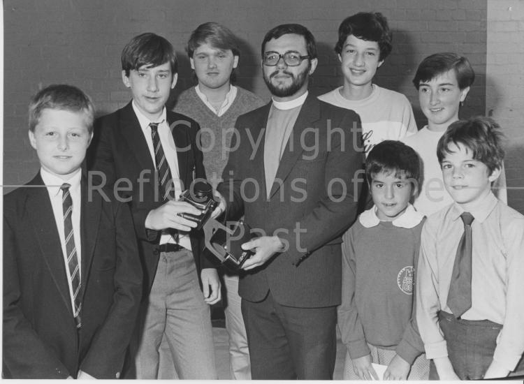 This picture was taken when the Vicar of Waltham Abbey came to make a presentation to Richard Clarke, who had won a photographic competition sponsored by Bywaters of Waltham Cross. This event was organised by Mr Foster and involved children across the Waltham Abbey Schools. Richard was presented with a new camera. When he left school he went on to work in the field of photography. The back row from left to right, shows Paul Sullivan, Mark Wilson and myself (Mandy Taylor), who were all 15 at the time. I was a runner-up in this competition, and still have the somewhat 'uninspiring' photo - taken in the Rose Gardens in Waltham Abbey. I remember thinking it was quite good at the time! |