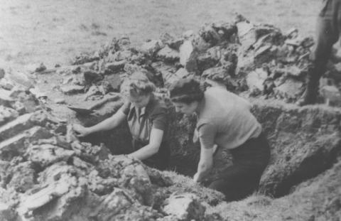 Kath Stewart and Jane Eldred dig out Incendiary bombs at Monkhams,... View Digging out bombs